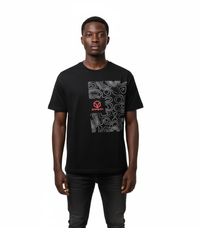 Стильная чёрная футболка с контрастным принтом и красным логотипом Sapsan. Подходит для повседневной одежды и спорта, выполнена из качественного хлопка с удобной посадкой.